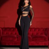 Espectacular mono acampando y asimétrico de una sola manga con aberturas y transparencias.