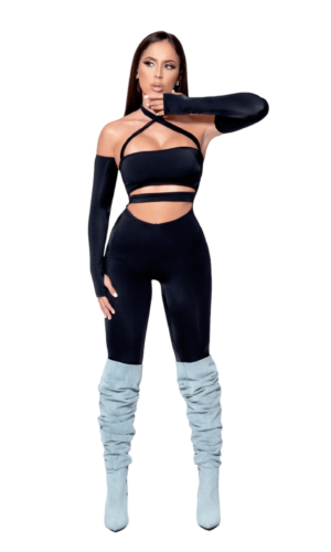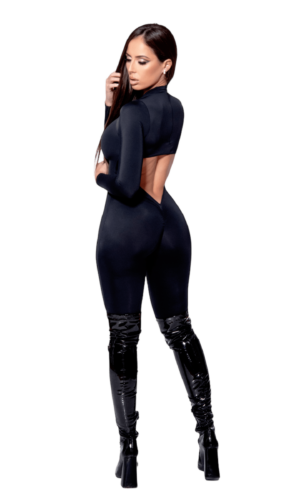 Sofisticado mono negro acampanado con detalle de encaje tanto ...