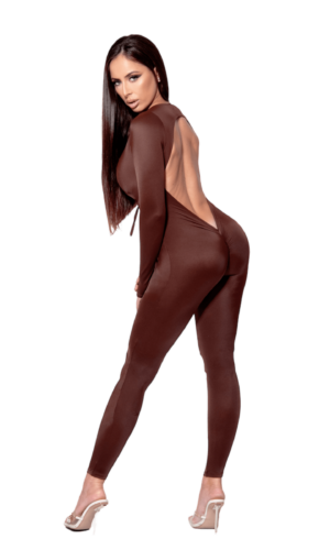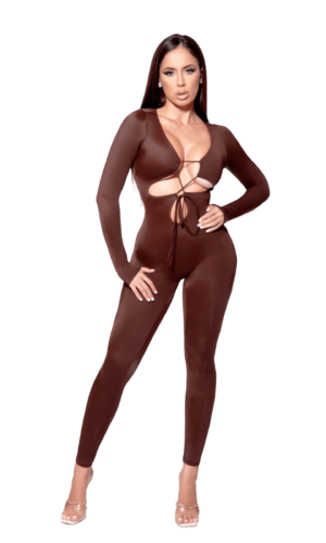 Fabuloso mono color chocolate con detalle de cadenas doradas ...